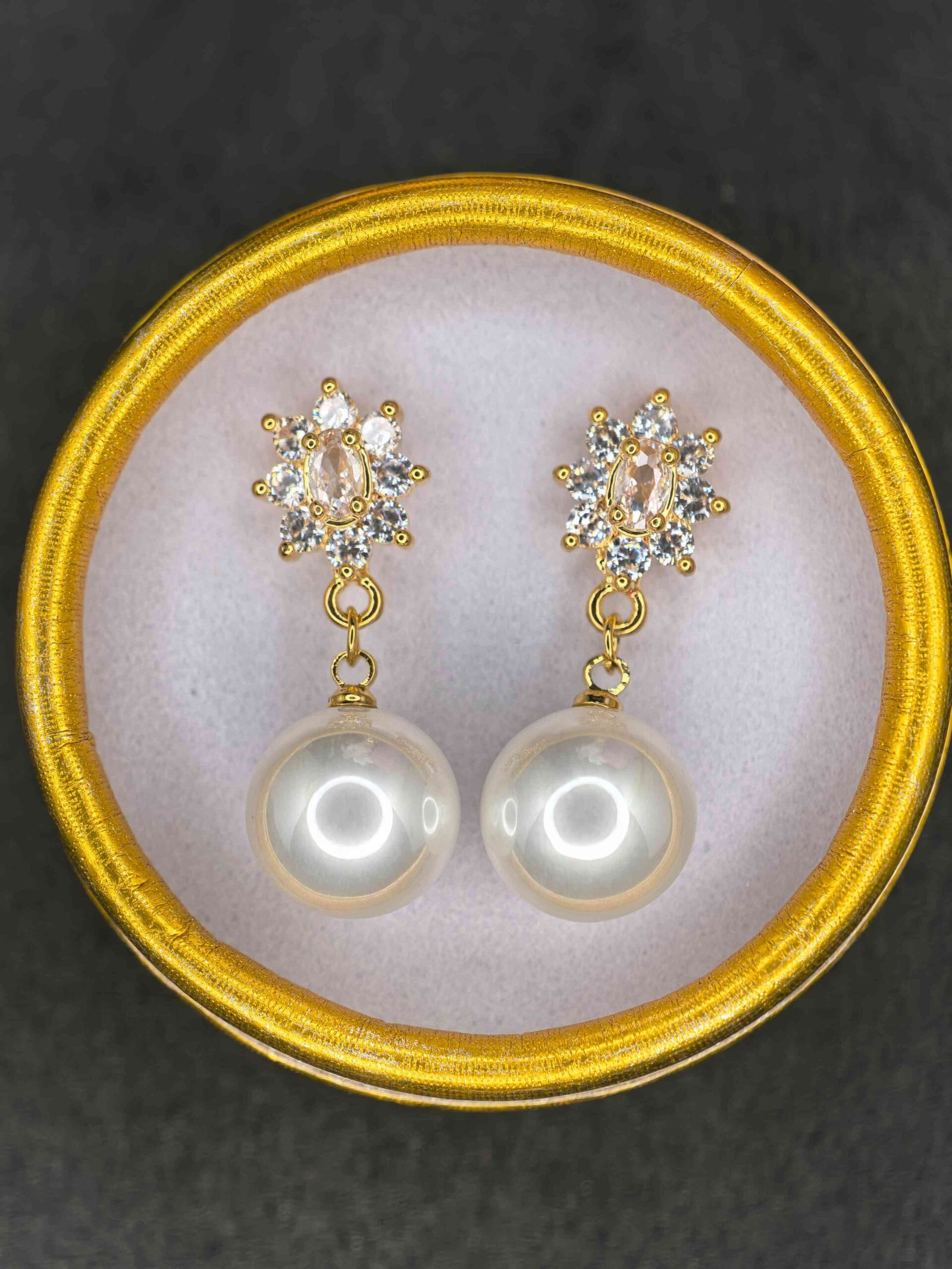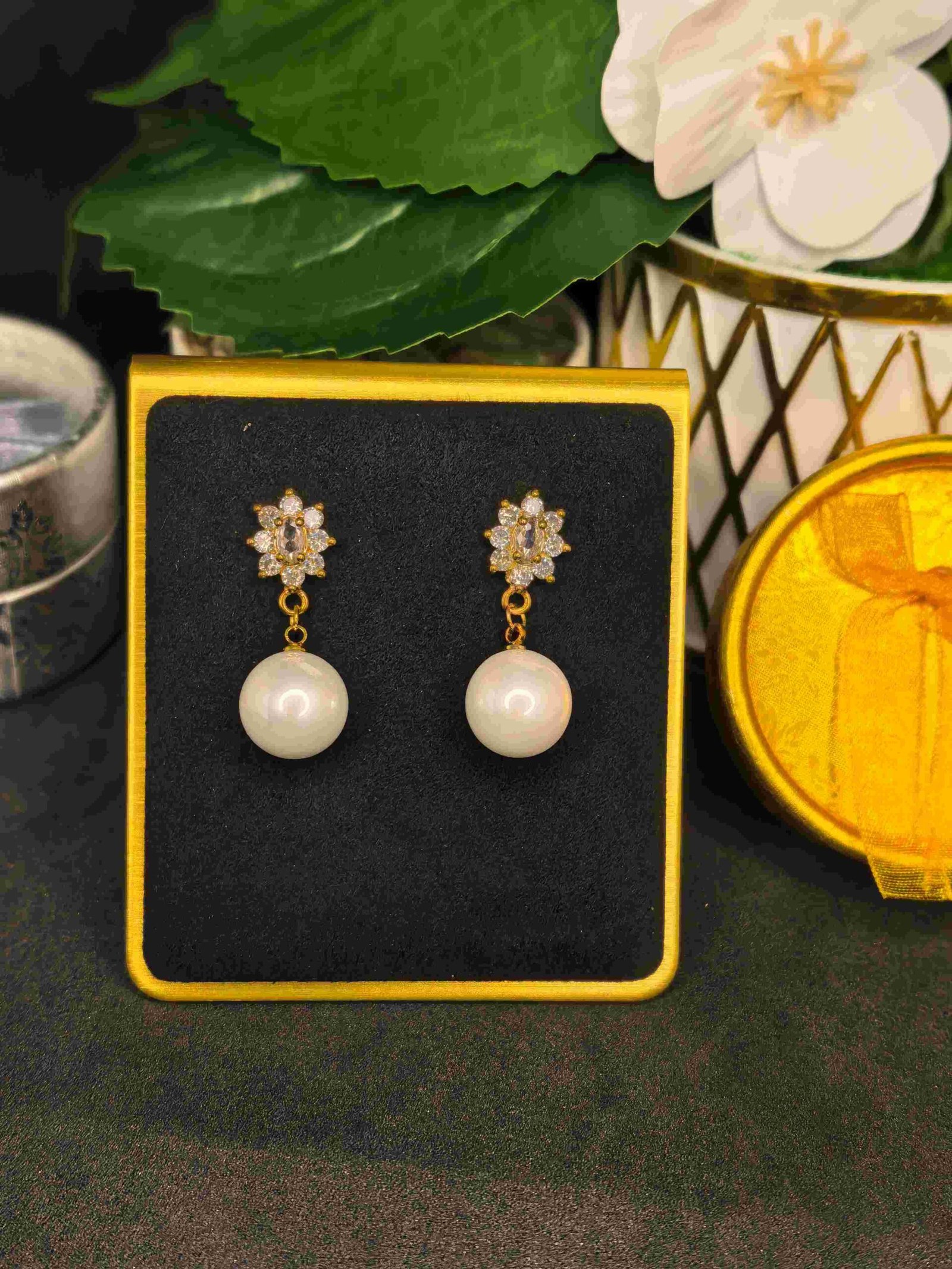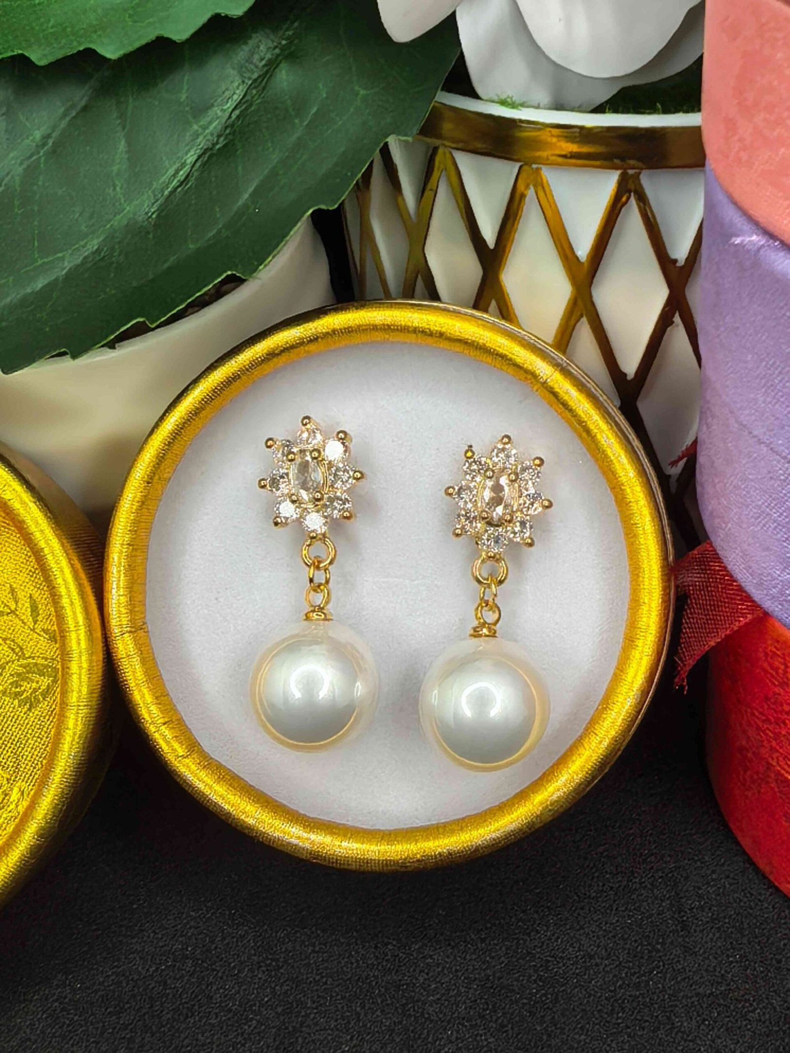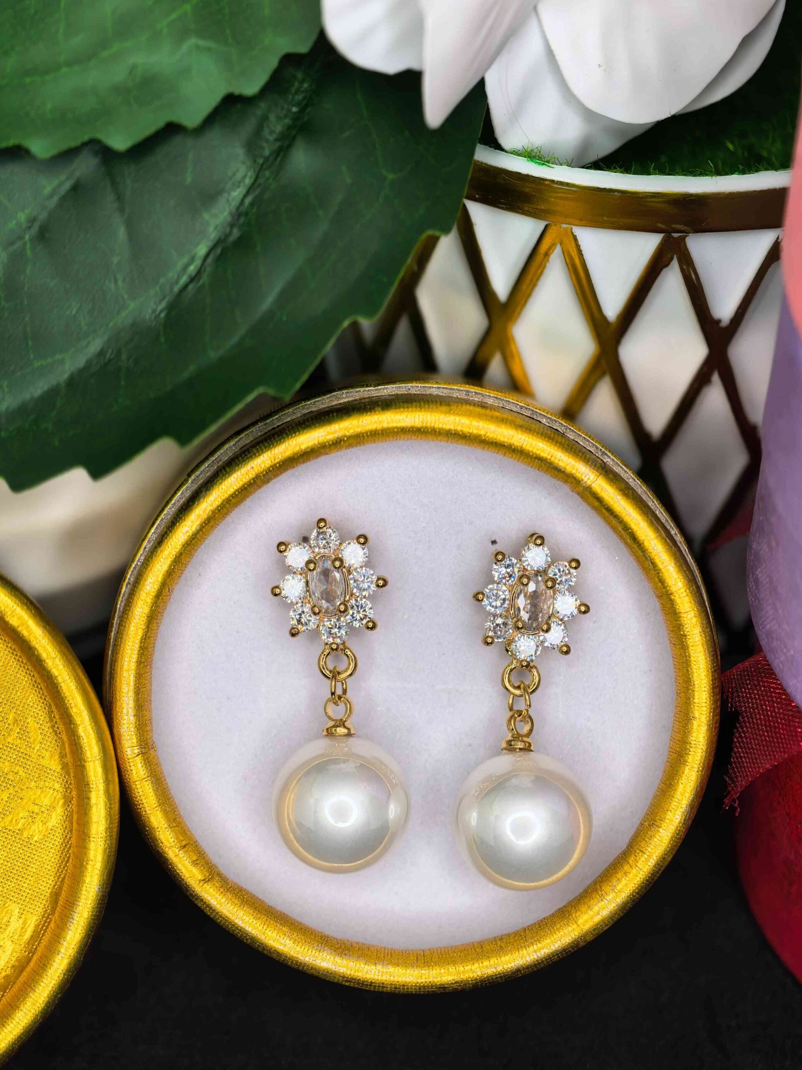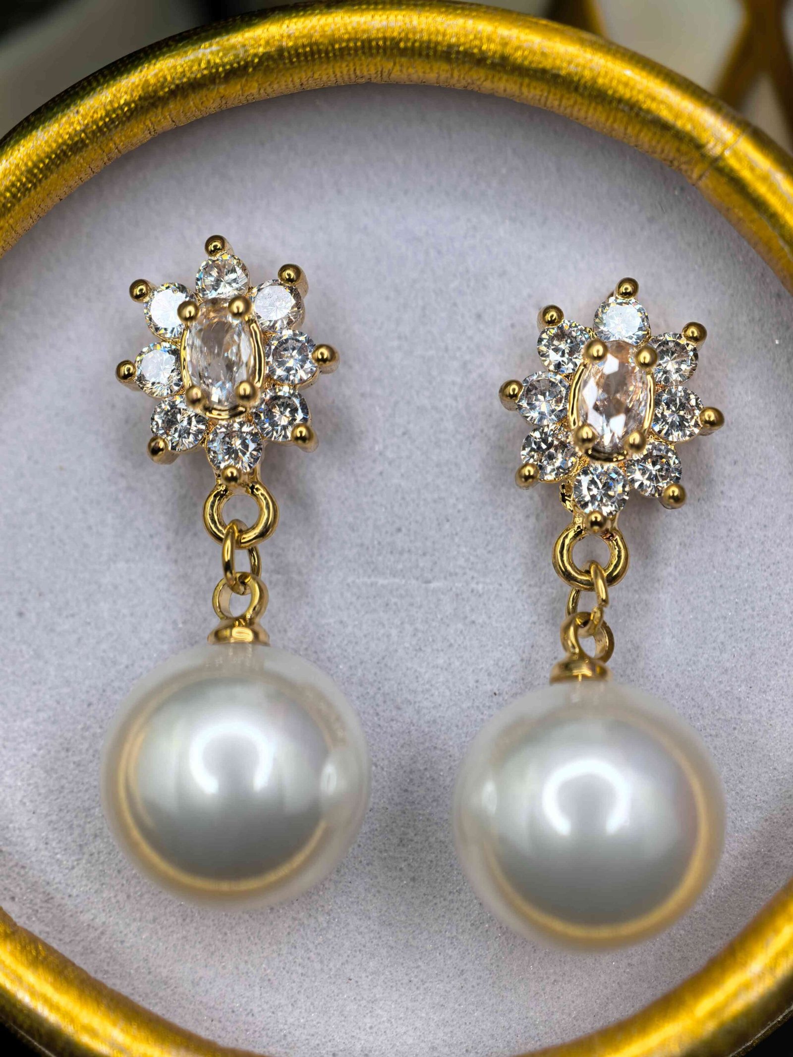 Drop shape pearl earings with a flower shaped crystal stud-পার্টি, বিয়ে ও উৎসবের জন্য পারফেক্ট ড্রপ শেপ পার্ল ইয়াররিংস