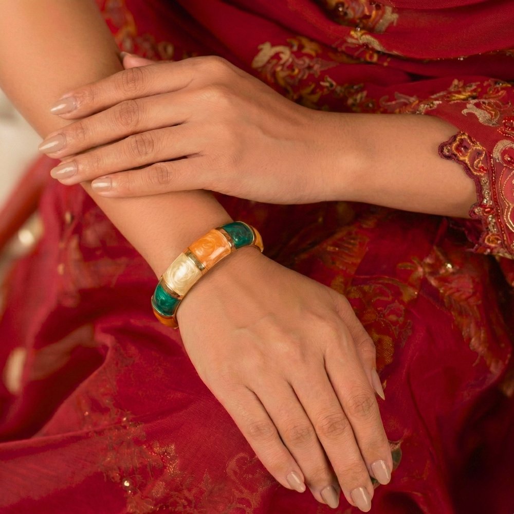 এই Elegant Multicolor Resin Bangle Gold-Tone Accents সহ পার্টি, ফ্যাশন বা বিশেষ অনুষ্ঠানে পরার জন্য perfect, হালকা ও আরামদায়ক ব্রেসলেট।