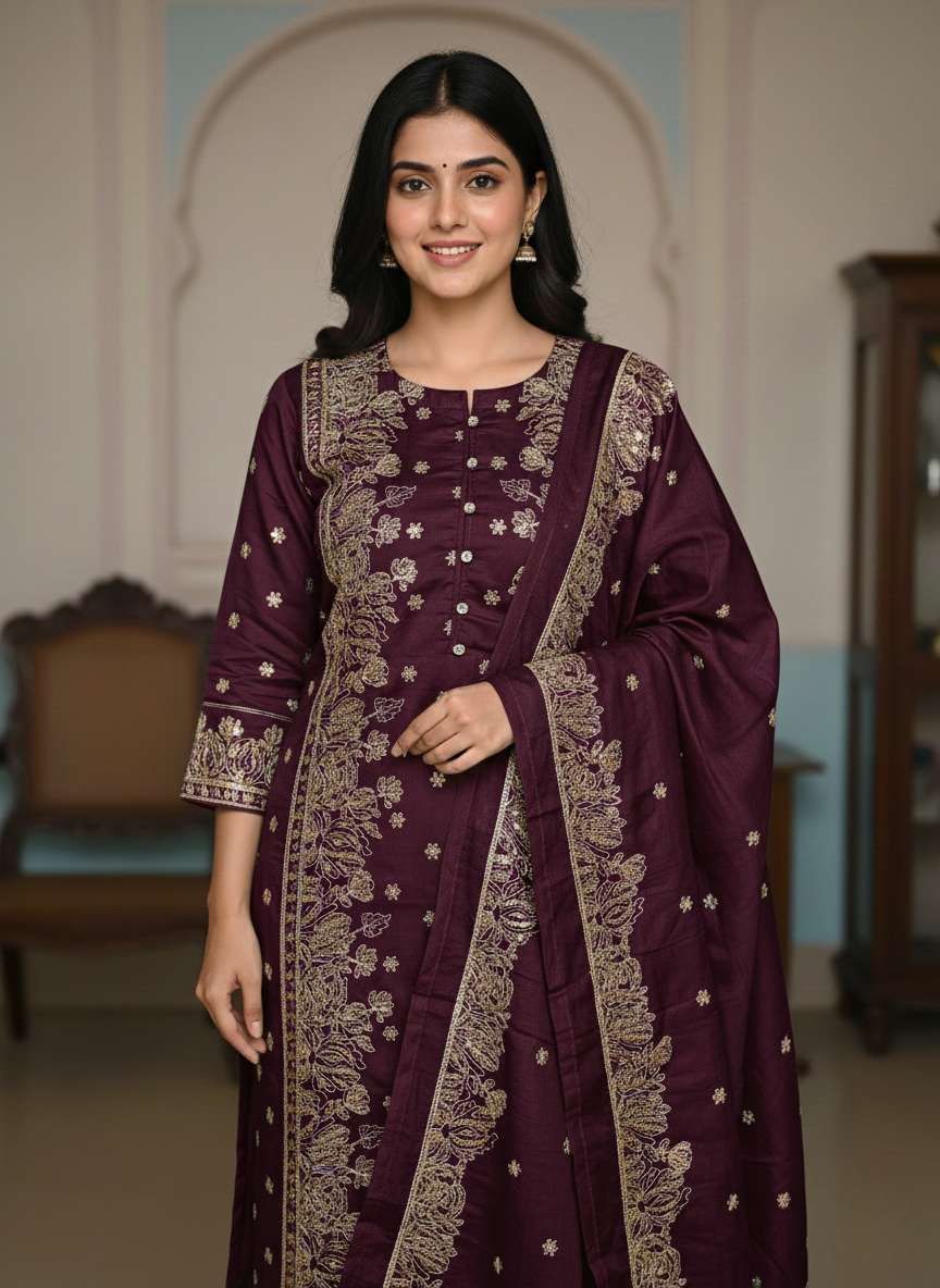 The outfit is completed with a coordinating, lightweight dupatta. The dupatta features a beautiful embroidered border that matches the kurta’s design, adding a delicate finish to the overall look. It can be draped in multiple styles, adding a layer of grace to your ensemble.