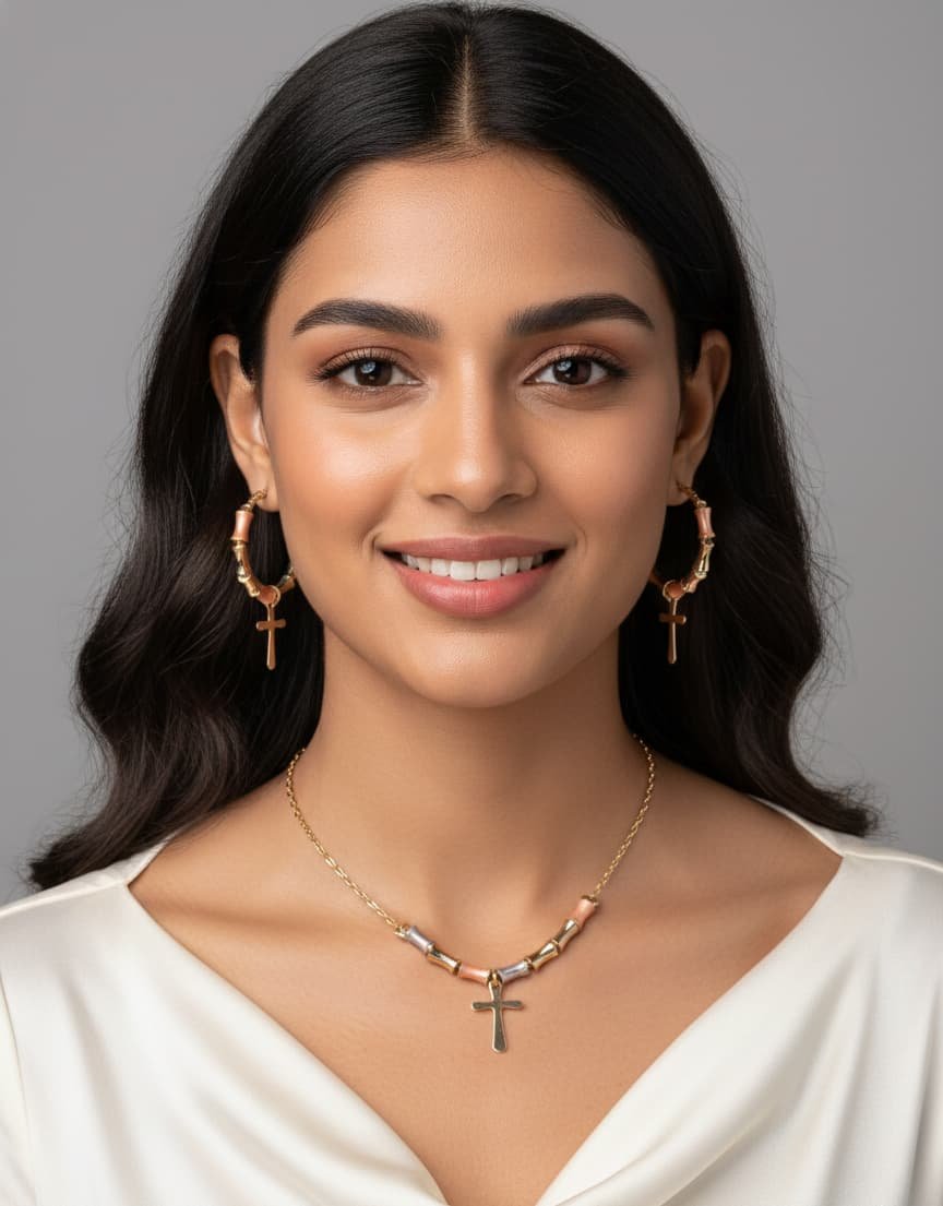 • স্টাইলিশ হুপ ইয়াররিং: গতানুগতিক কানের দুলের বদলে এতে আছে ট্রেন্ডি হুপ ইয়াররিং, যার নিচে ঝুলন্ত ক্রস পেনডেন্ট আপনার লুকে আনবে স্মার্টনেস।