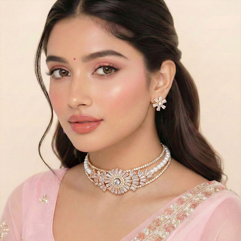 Gold plated choker necklace with white stone and pearl মহিলাদের জন্য একটি Classic and timeless jewelry piece, যা আধুনিক ফ্যাশন ও আভিজাত্যের এক অনন্য মেলবন্ধন। এই রোজ গোল্ড পার্ল অ্যান্ড ক্রিস্টাল ফ্লাওয়ার নেকলেস সেটটি একটি প্রিমিয়াম রোজ গোল্ড কালার মেটাল বেসে তৈরি, যার সেন্টারে রয়েছে বড় ফুল আকৃতির ঝলমলে Crystal stone flower design। ফুলের চারপাশে ব্যাগেট কাট ক্রিস্টাল স্টোন ব্যবহার করা হয়েছে, যা নেকলেসটিকে একটি Extremely attractive and luxury look প্রদান করে। এক পাশে সাদা পার্ল বিডের সূক্ষ্ম কাজ এর ডিজাইনকে আরও বেশি এলিগ্যান্ট করে তুলেছে। এটি মূলত রুচিশীল ব্যক্তিত্বের এক অনন্য প্রকাশ যা যেকোনো অনুষ্ঠানে সবার নজরে আসবে। উচ্চমানের Simulated pearls and crystal stones দিয়ে তৈরি এই গয়নাটি অত্যন্ত টেকসই এবং এর উজ্জ্বলতা দীর্ঘস্থায়ী হয়।