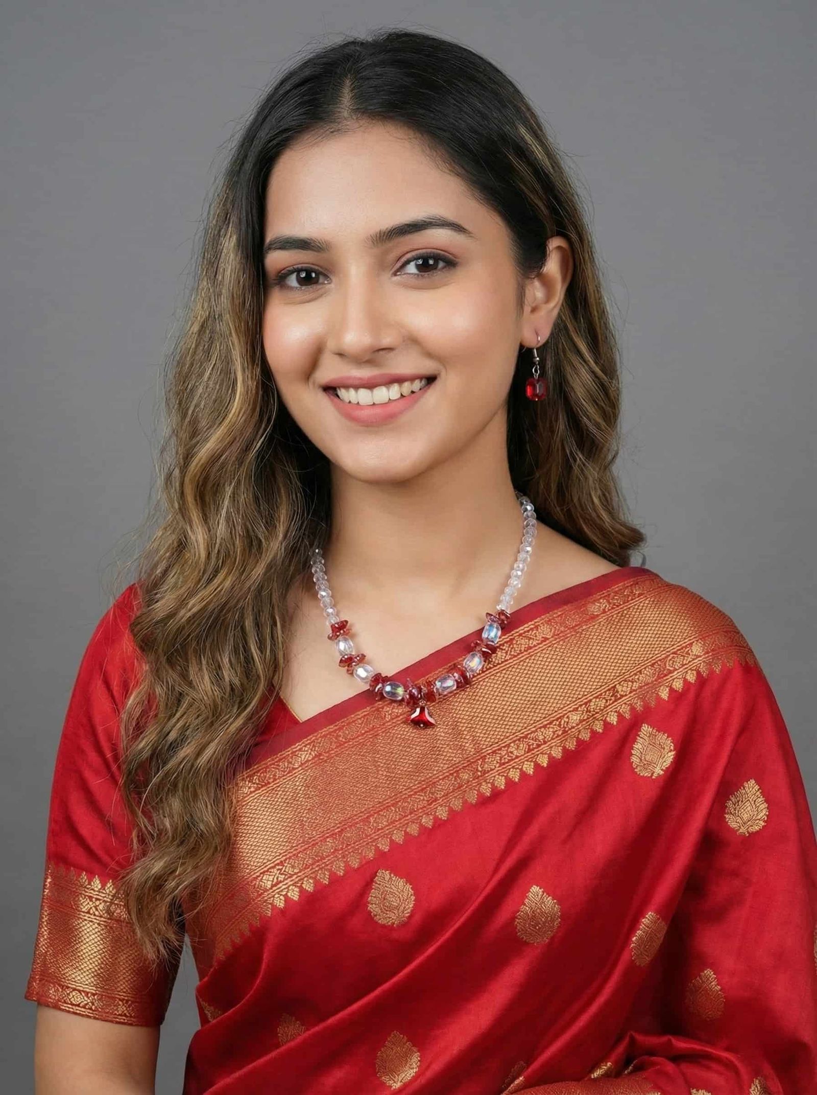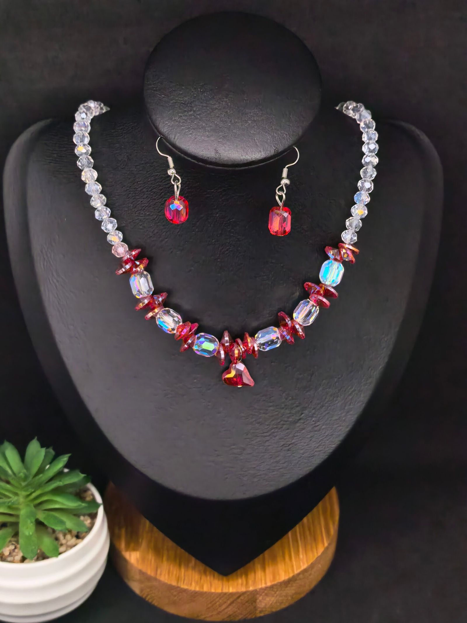 Include: হোয়াইট ও রেড গ্লাস বিডেড মালা ও ম্যাচিং ইয়াররিং