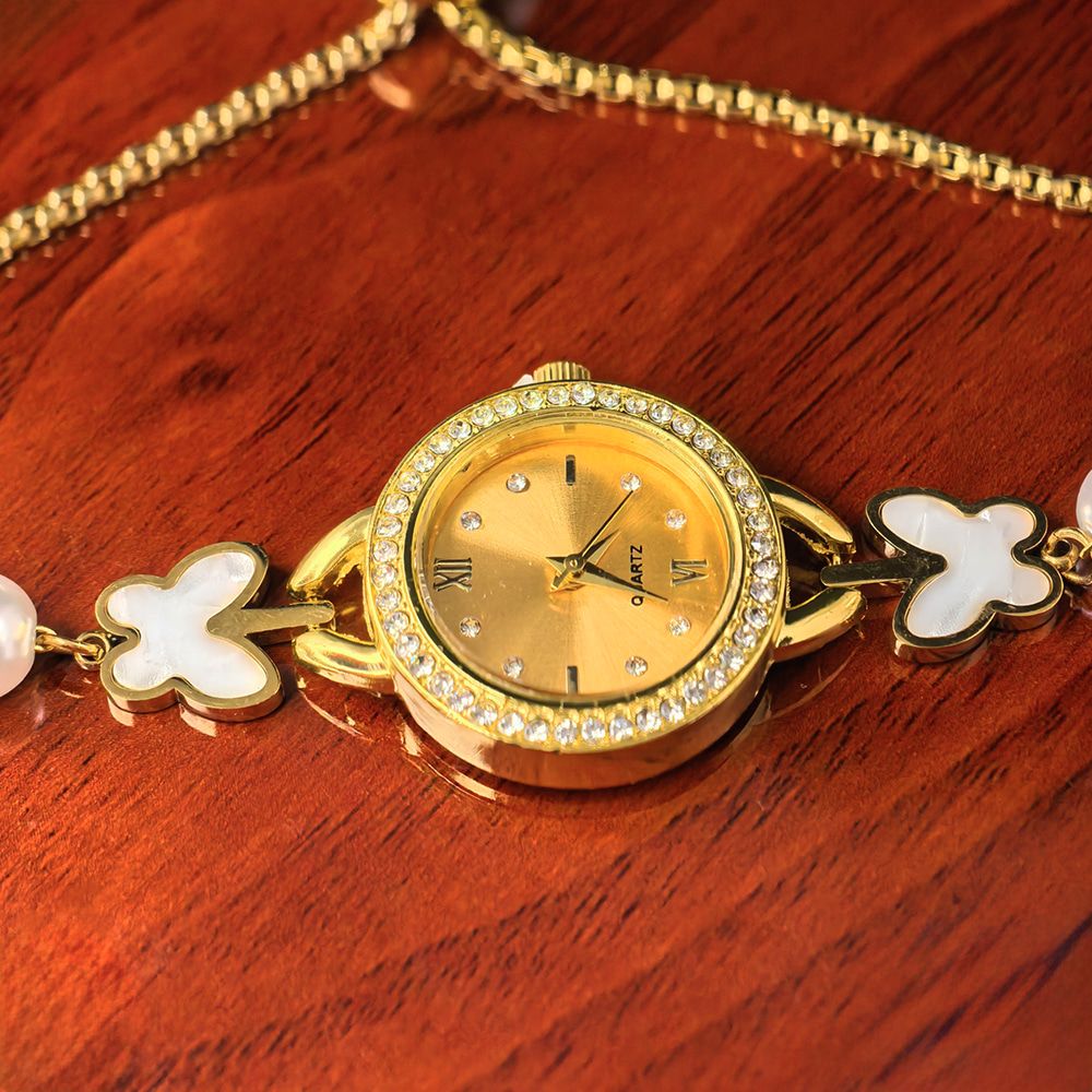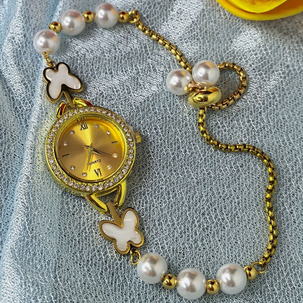 Women’s gold toned quartz bracelet butterfly design with white pearl – মহিলাদের জন্য রাজকীয় ব্রেসলেট ঘড়ি ও বাটারফ্লাই ওয়াচ কালেকশন