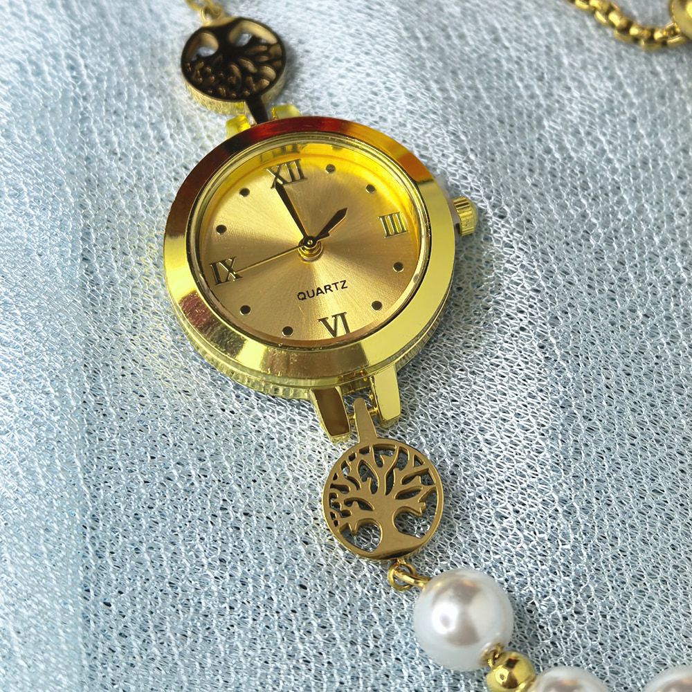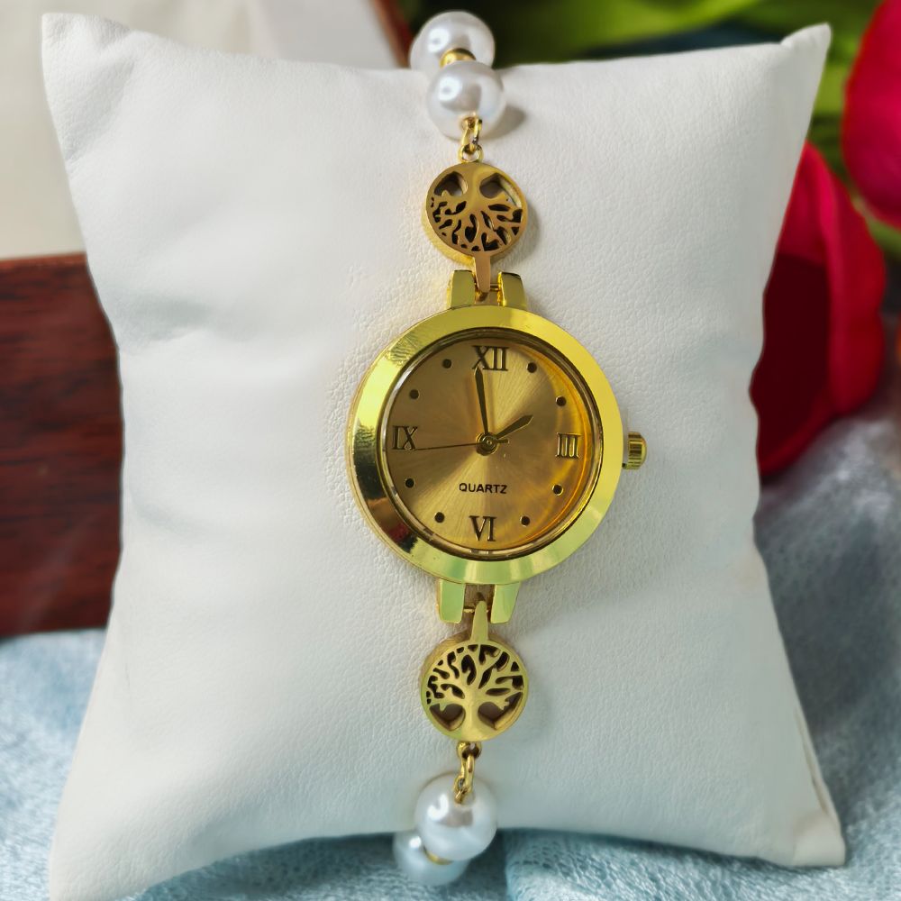 এই ঘড়িটির বিশেষত্ব হলো এর ইউনিক ব্রেসলেট ডিজাইন, যেখানে গোল্ড টোন চেইনের সাথে প্রিমিয়াম Pearl Beads এবং চমৎকার ফুল আকৃতির Floral Charm যুক্ত করা হয়েছে। এটি শাড়ি, কামিজ বা যেকোনো ফেস্টিভ ড্রেসের সাথে দারুণ মানিয়ে যায়। এর Stainless Steel বডি দীর্ঘস্থায়ী উজ্জ্বলতা নিশ্চিত করে এবং সহজে রঙ নষ্ট হয় না। পার্টি, বিয়ে বা যেকোনো স্পেশাল অনুষ্ঠানে নিজেকে গ্রেসফুল করতে এটি মহিলাদের জন্য একটি Masterpiece accessory। এর ওজনে হালকা হওয়ায় এটি দীর্ঘ সময় হাতে পরে থাকলেও আপনি পাবেন সর্বোচ্চ স্বাচ্ছন্দ্য।